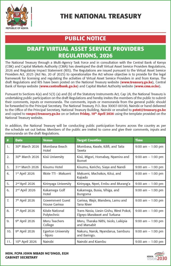 The window for submitting comments, inputs, or memoranda ends on Friday, April 10, 2026. Submissions can be sent directly to the National Treasury via email at vasps@treasury.go.ke.